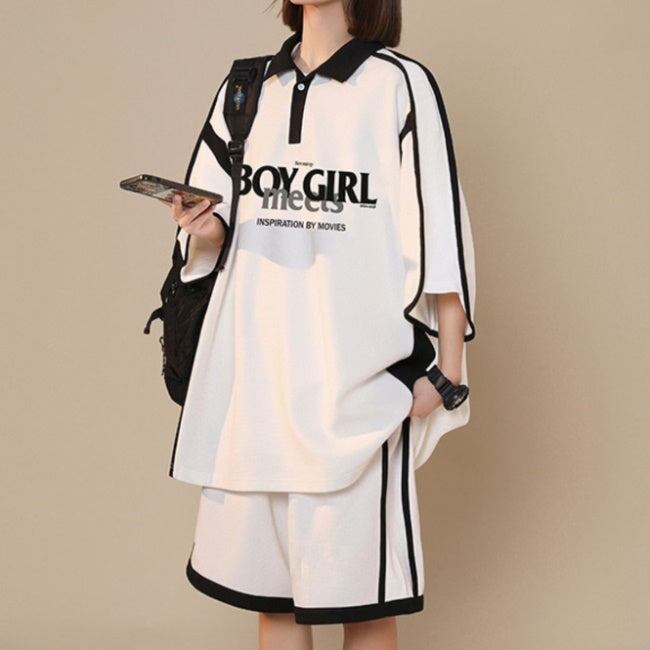 半袖 ジャージ セットアップ レディース 韓国 ポロシャツ ハーフパンツ 上下セット ロゴ ビッグシルエット スポーツウェア