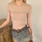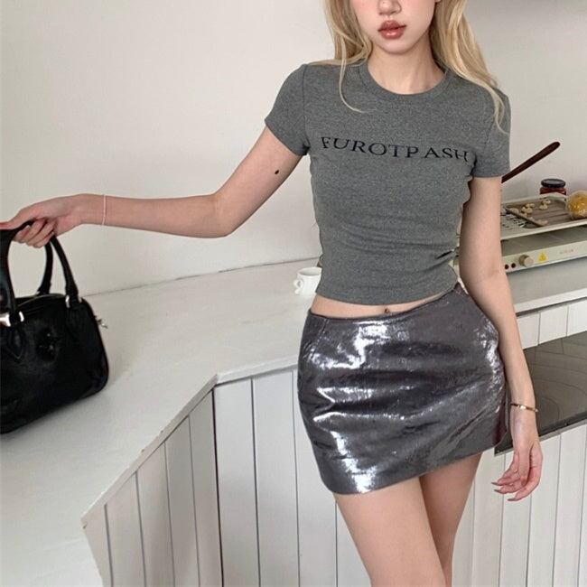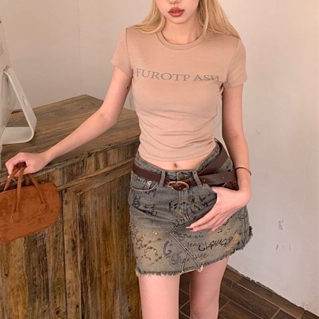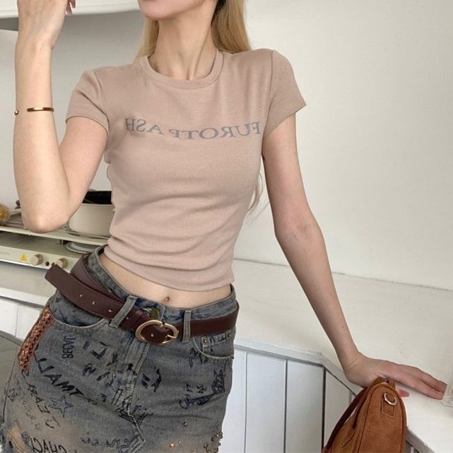 クロップTシャツ ロゴ プリント レディース 韓国 ファッション タイトシルエット ショート丈 ミニマム 夏トップス