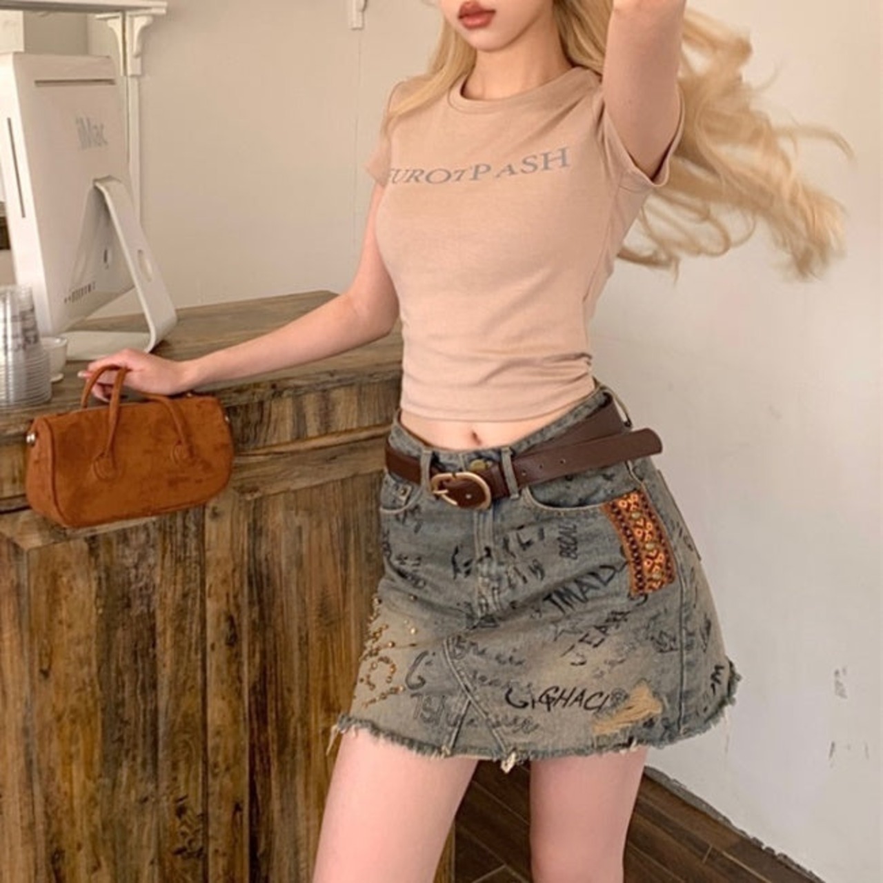 クロップド Tシャツ レディース 韓国 ロゴ プリント タイトシルエット ショート丈 ミニマム T 夏トップス