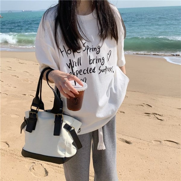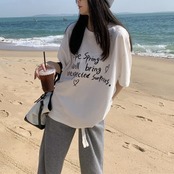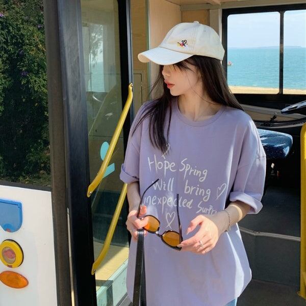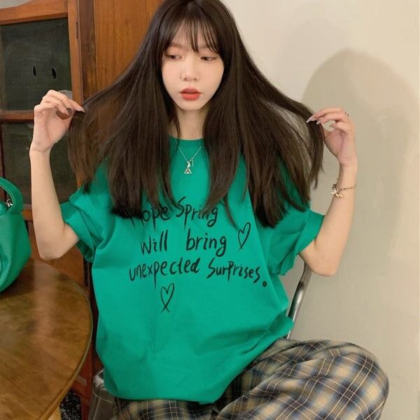 Tシャツ 手書きロゴ レディース 韓国 ファッション ハート メッセージT ビッグシルエット オーバーサイズ 夏 トップス 半袖 シンプル ロング