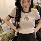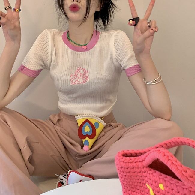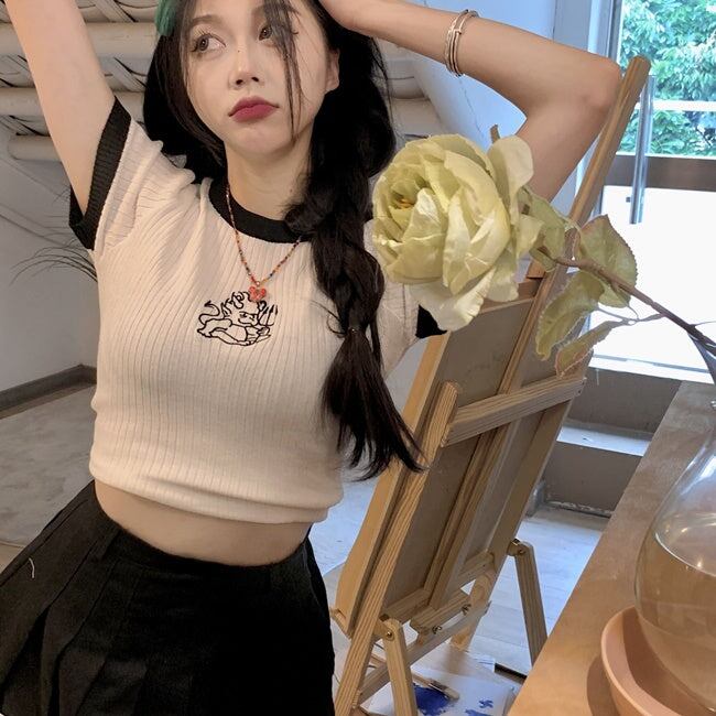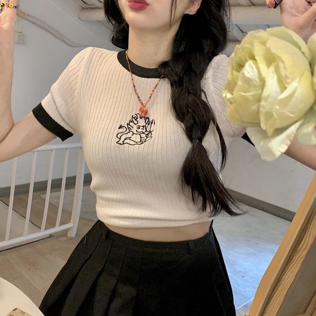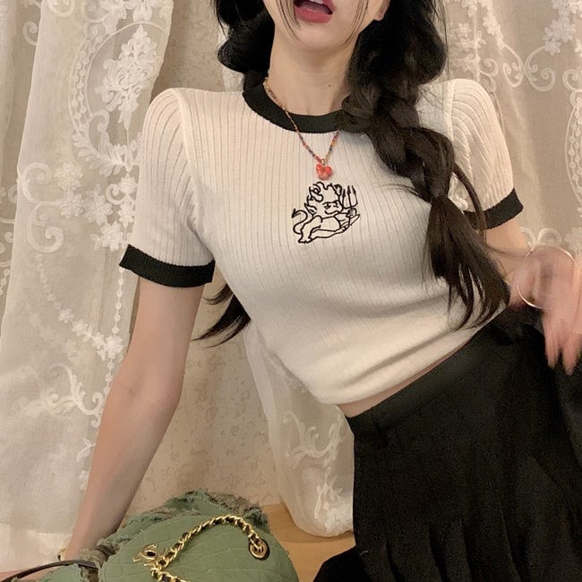 Tシャツ 白 トップス レディース 韓国 ファッション 夏 パイピング バイカラー デビル 小悪魔 キャラ 刺繍 かわいい ガーリー タイトトップス