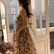 花柄 ワンピース レディース 韓国 ファッション エアリー Aライン フレア ロング ノースリーブ ホルターネック リボン シャーリング チューブ サマードレス 夏ワンピース