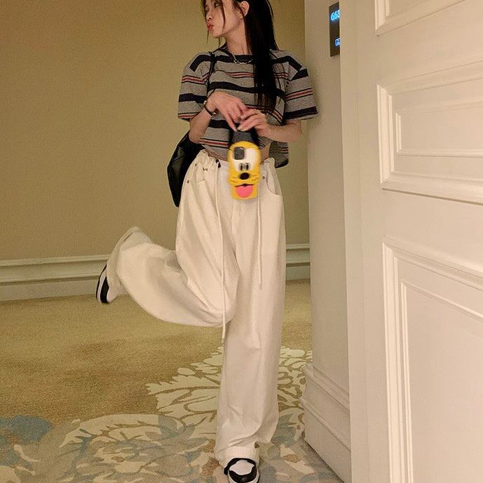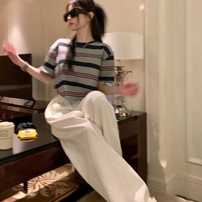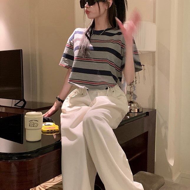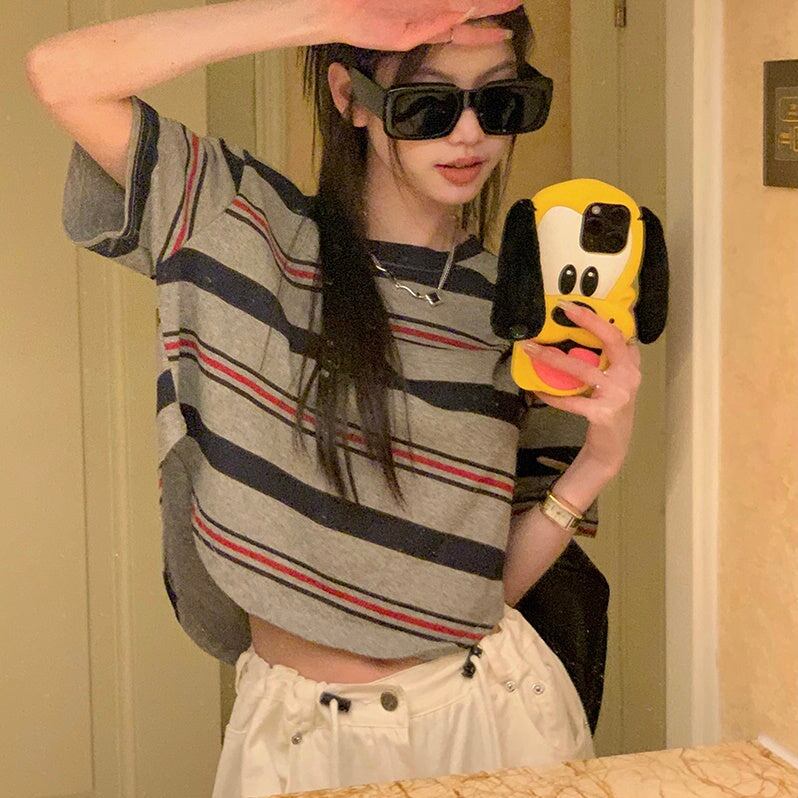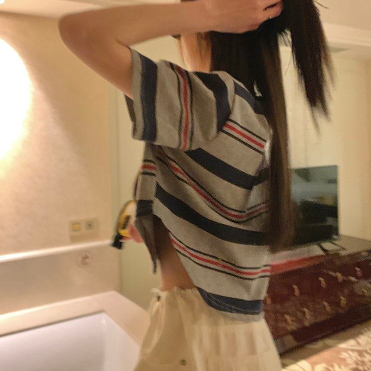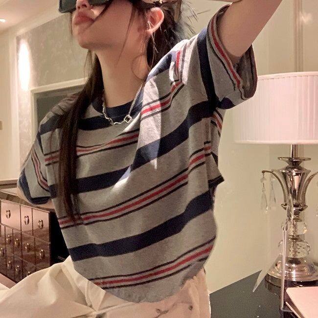 ボーダーTシャツ レディース 韓国 ファッション クロップド トップス 半袖 マルチボーダー ワイドシルエット