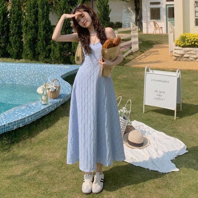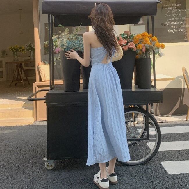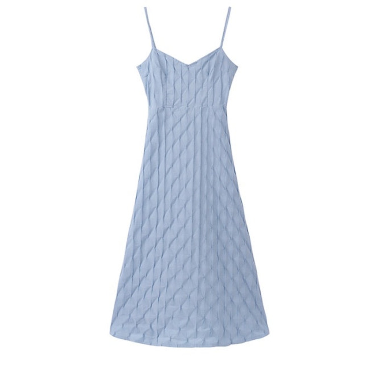 夏 キャミ ワンピース レディース 韓国 ファッション 夏 背中見せ ノースリーブ サマー ロングワンピース ブルー