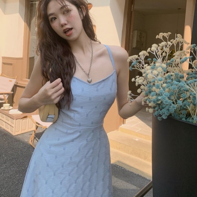 ワンピース バックカット レディース 韓国 ファッション 背中見せワンピ サマードレス キャミワンピ リボン ジャガード チェック柄 ダイヤ柄 おしゃれ ブルー