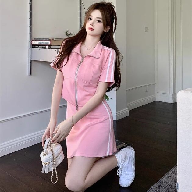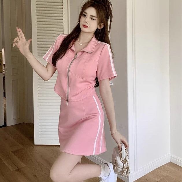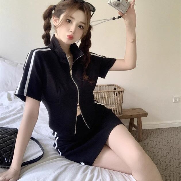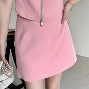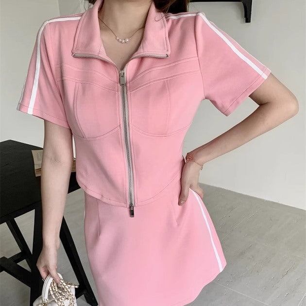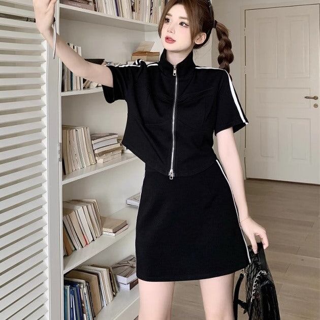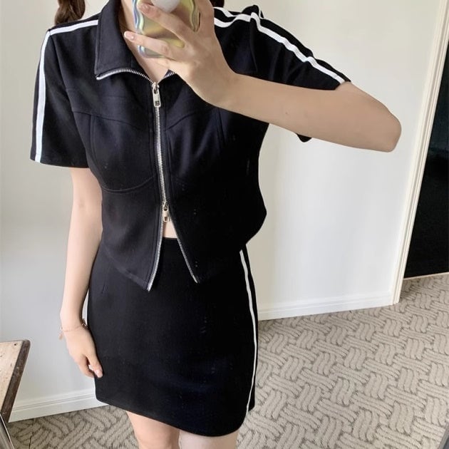 セットアップ サイドライン スカート レディース 韓国 ファッション カットソー ジップカーデ ラインスカート 半袖 カットソー 2ピースセット ロングスカート