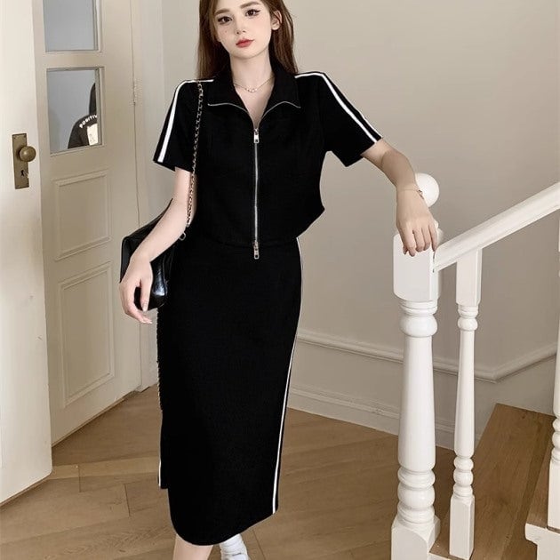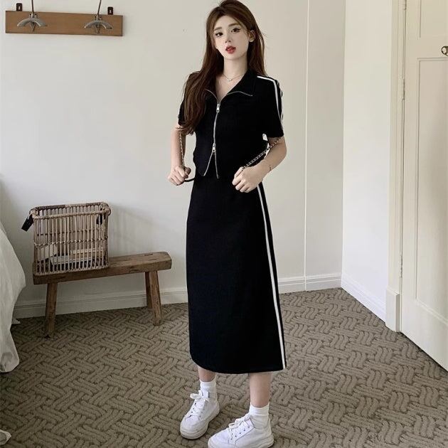 セットアップ サイドライン スカート レディース 韓国 ファッション カットソー ジップカーデ ラインスカート 半袖 カットソー 2ピースセット ロングスカート