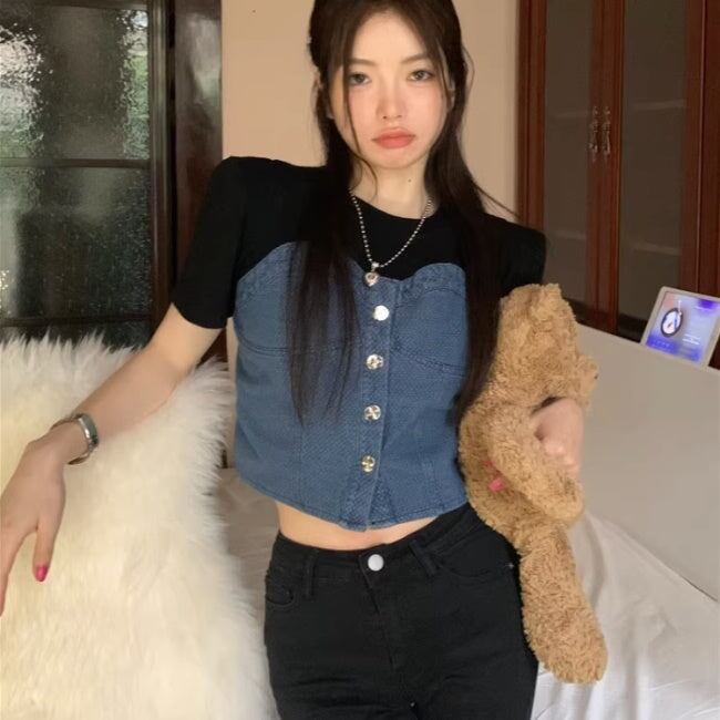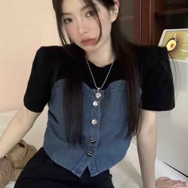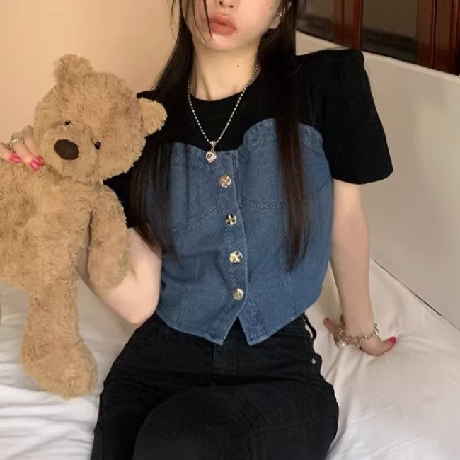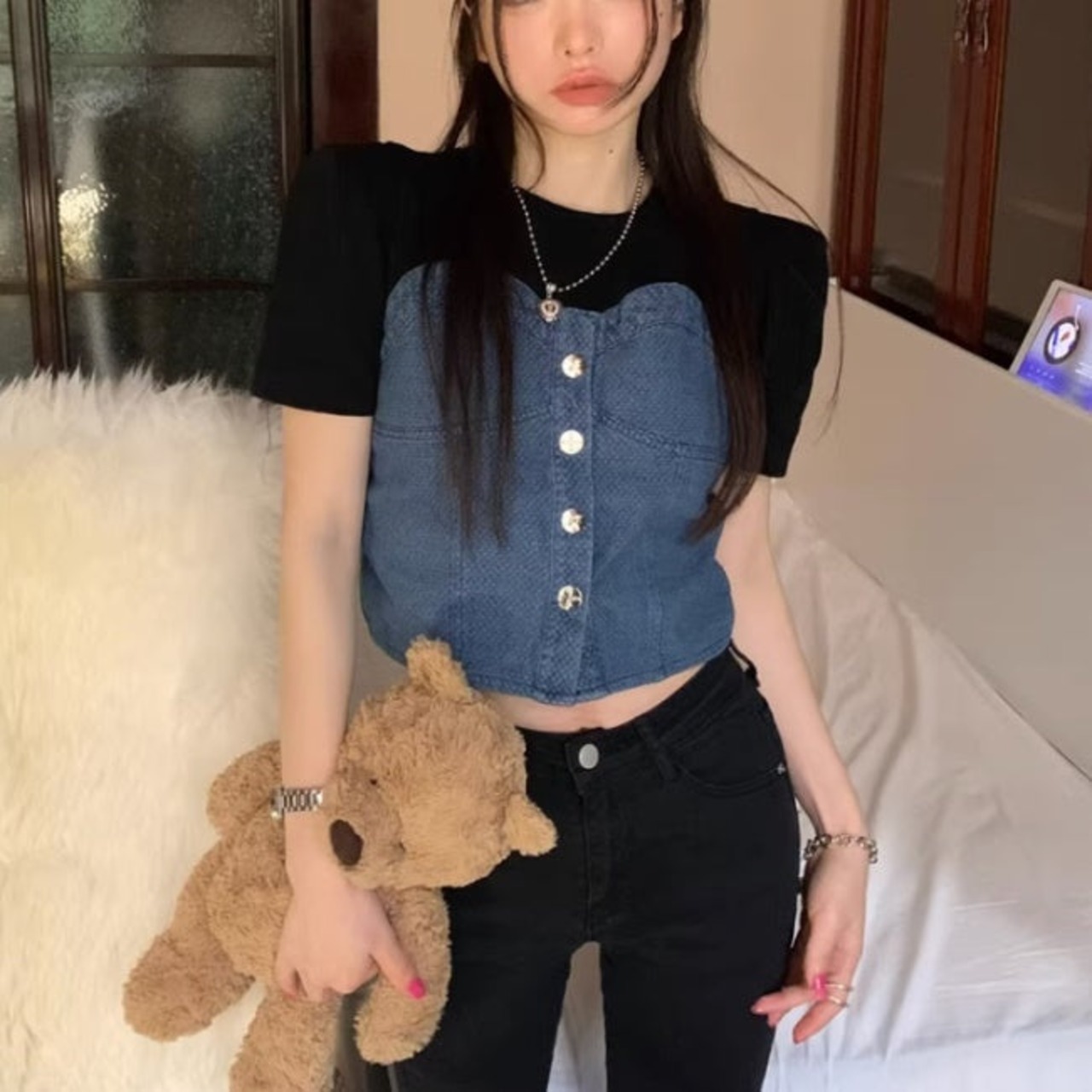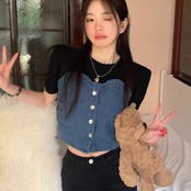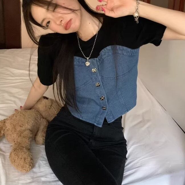 デニム ビスチェ ドッキング Tシャツ レディース 韓国 ファッション レイヤード風 夏 半袖 トップス