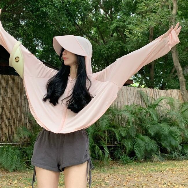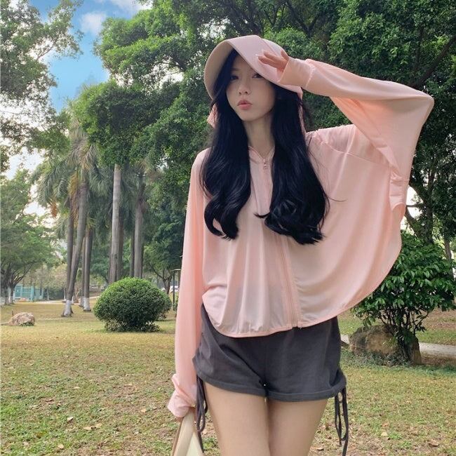 速乾 日焼け止め パーカー レディース 韓国 ファッション フード つば付き ドルマンスリーブ クロップド丈 おしゃれ 夏パーカー 薄手 カバーアップ 日焼け防止 顔 腕 ロングスリーブ