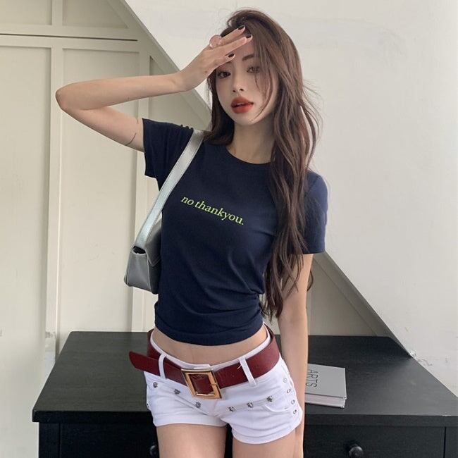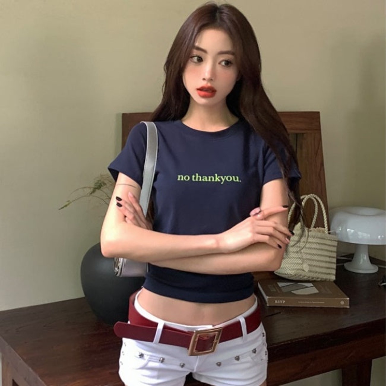 タイトTシャツ 半袖 レディース 韓国 ファッション ロゴプリント シンプル ベーシック レターT メッセージ ネイビー グレー 夏T