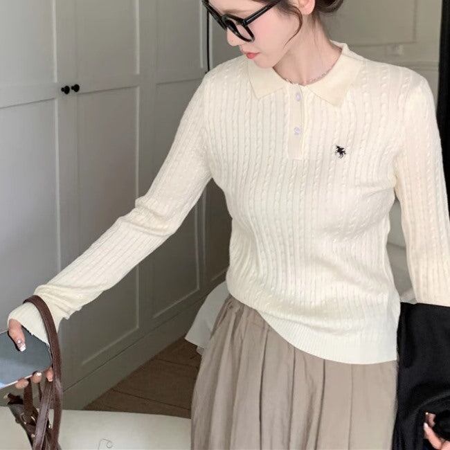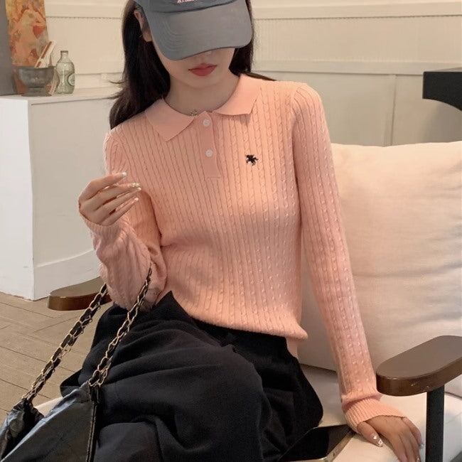 ポロ襟ニット ケーブルニット レディース 韓国 ファッション タイトフィット 秋トップス 薄手ニット ポロシャツ