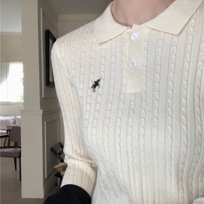 ポロ ニット 長袖 レディース ケーブルニット 韓国 ファッション タイトフィット ワンポイント ロゴ 秋冬 トップス