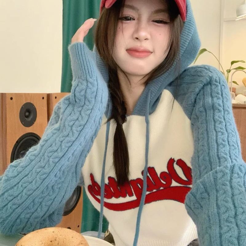 パーカー レディース 韓国 ファッション ケーブルニット 秋冬トップス バイカラー フードニット ガーリー かわいい おしゃれ 秋トップス
