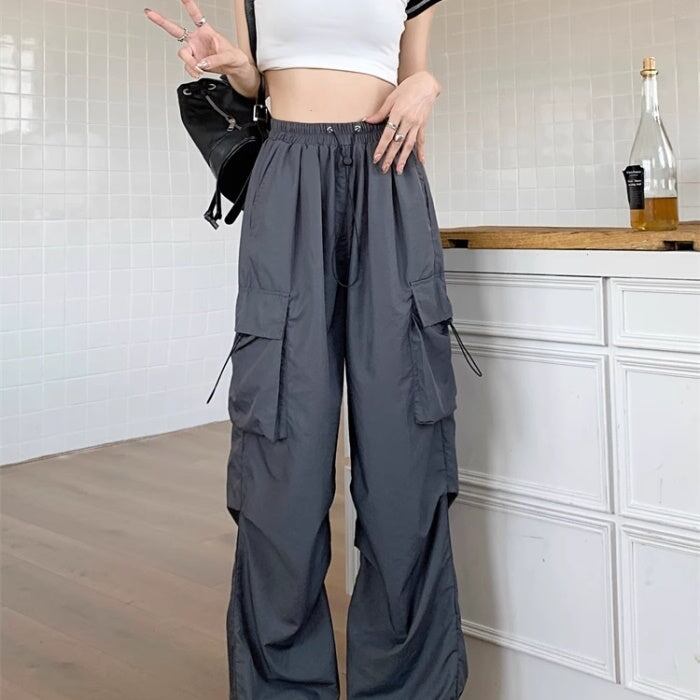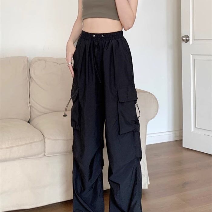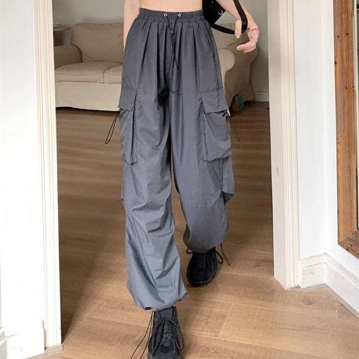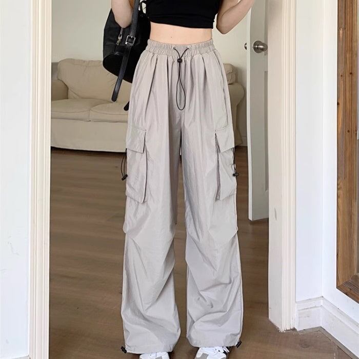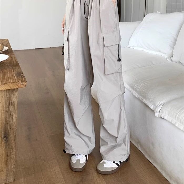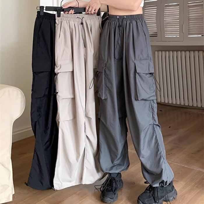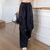 ナイロン パラシュート カーゴパンツ レディース 韓国 ファッション サイドポケット ドローコード ワイドパンツ
