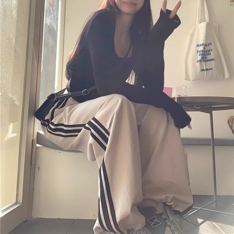 パンツ レディース 韓国 ファッション ラインパンツ サイドライン バイカラー 黒 赤 カジュアルパンツ ボリューム 秋冬