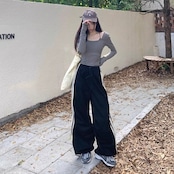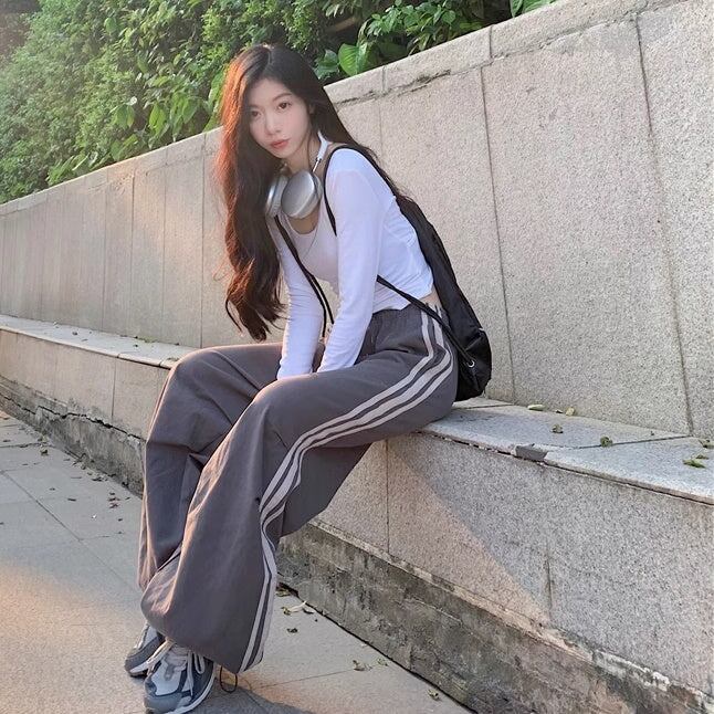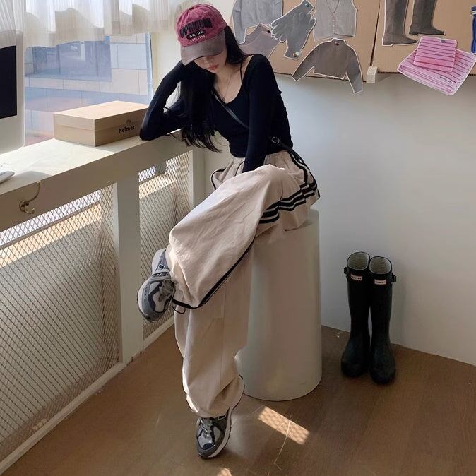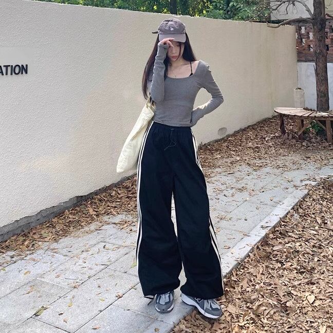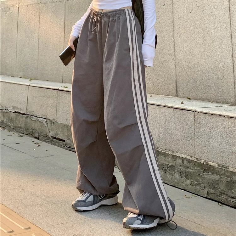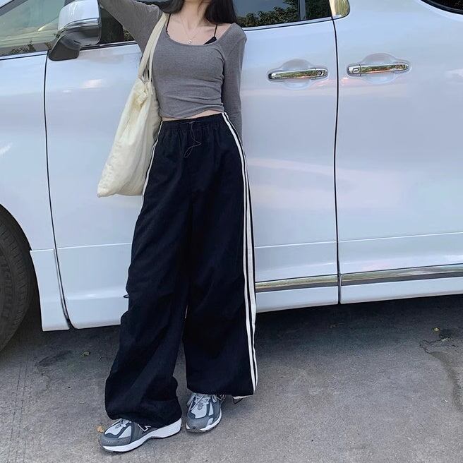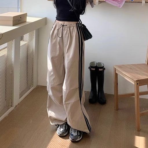 ライン ナイロンパンツ レディース 韓国 ファッション サイドライン パラシュート パンツ ワイド