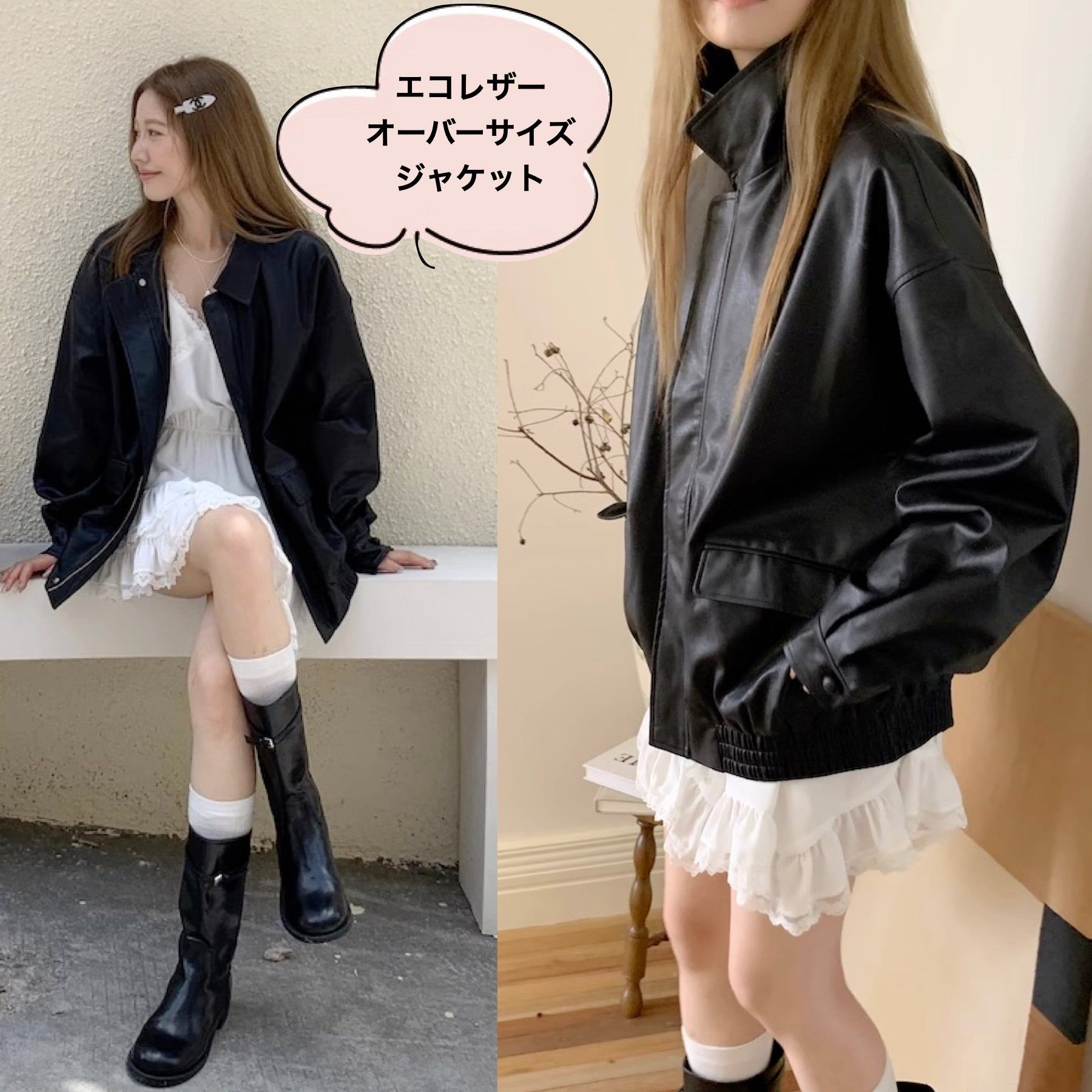 エコレザー ジャケット レディース 韓国 ファッション フェイク レザー ジップブルゾン オーバーサイズ アウター