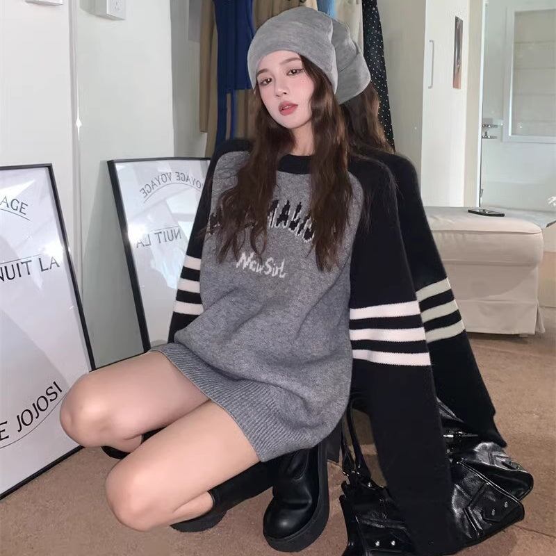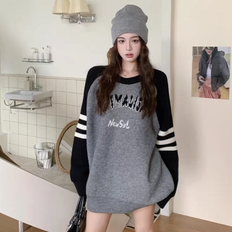 ニット レディース 韓国 ファッション ラグラン ライン袖 バイカラー ロゴ 秋冬トップス アメカジ おしゃれ かわいい メンズライク ユニセックス